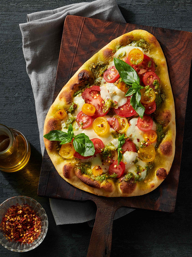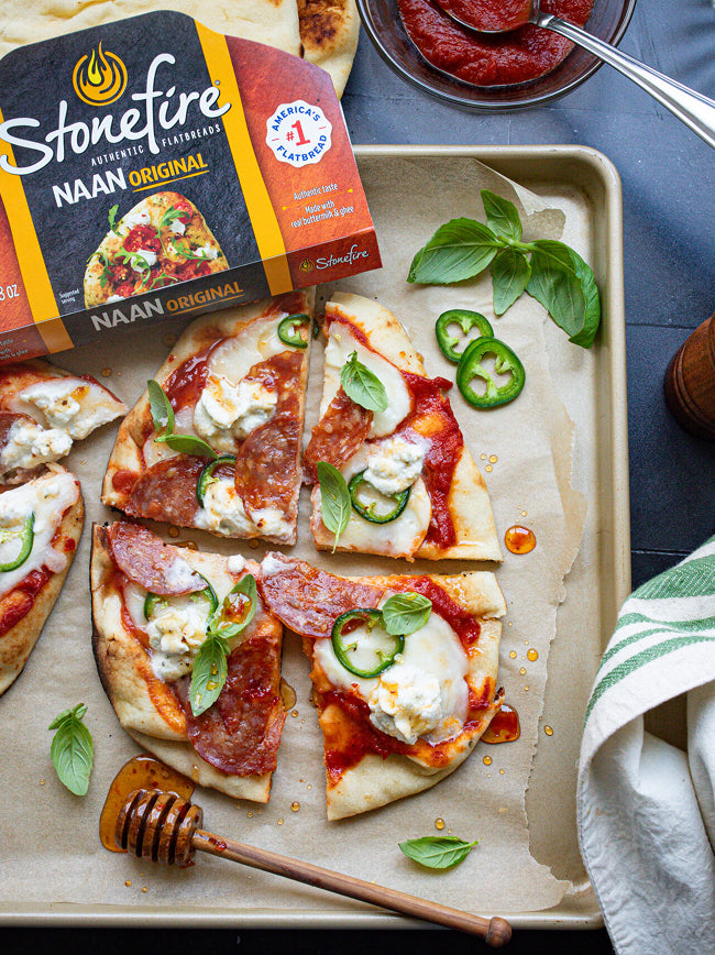 Pizza at home with a delicious twist. Take pizza night to the next level with this bold and flavor-packed Grilled Hot Honey Ricotta Soppressata Pizza on Stonefire® Naan. Crispy, fire-baked naan is the perfect canvas for melty mozzarella, spicy soppressata, and charred jalapeños. A creamy whipped ricotta swirl balances the heat, while a drizzle of homemade hot honey ties everything...