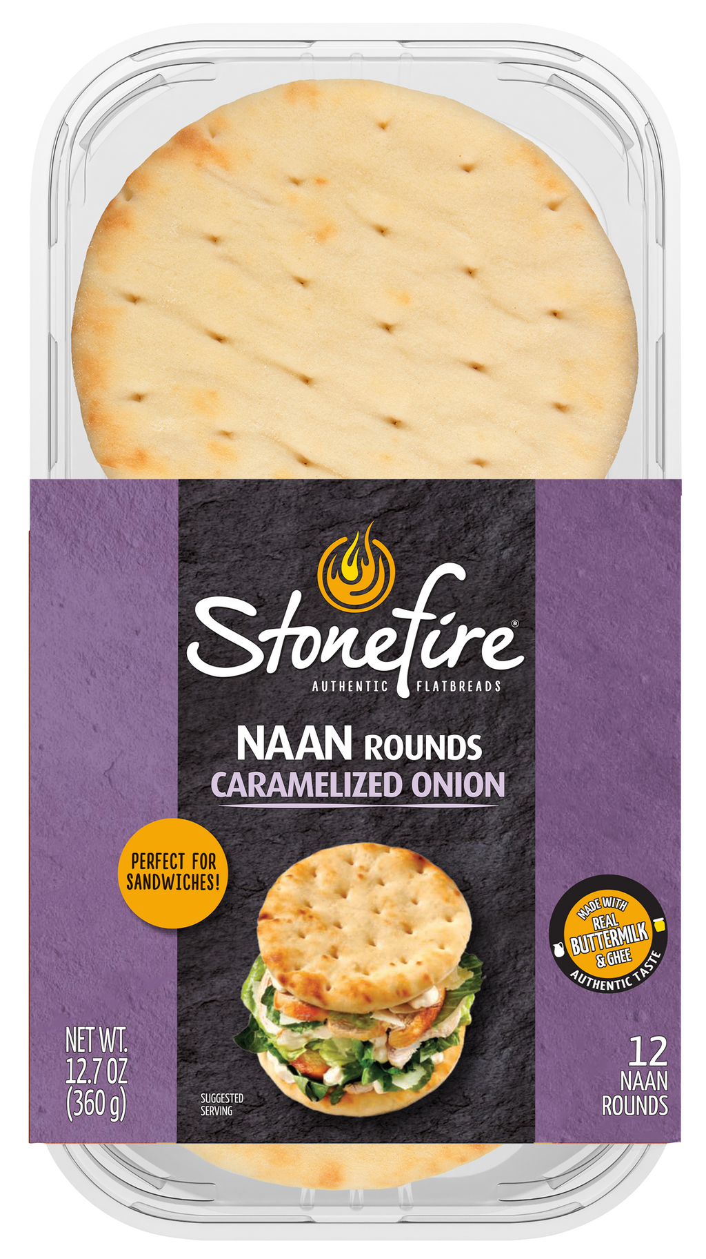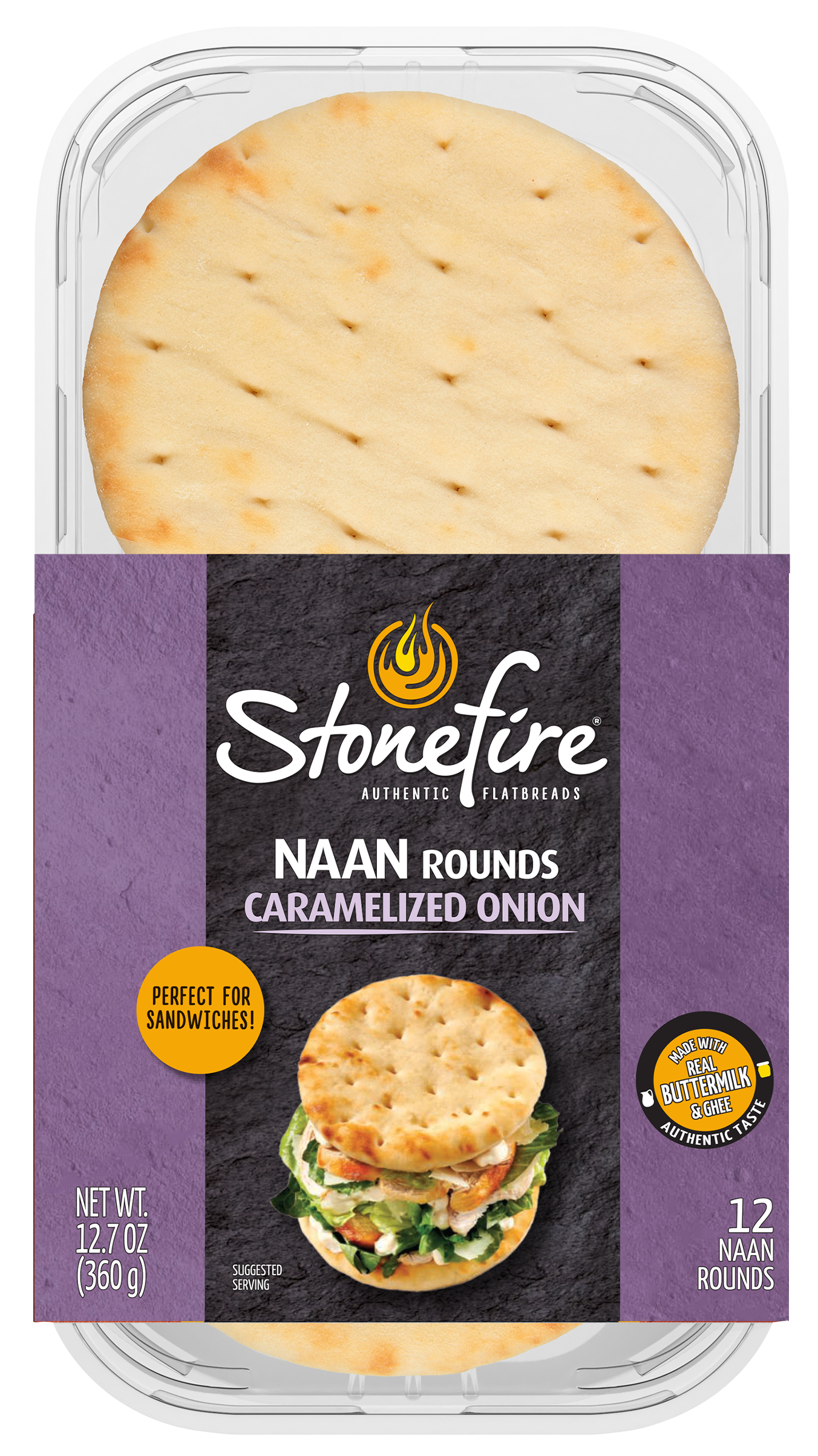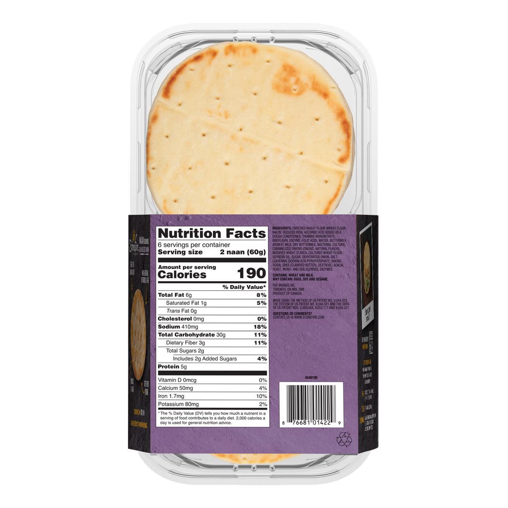 Stonefire® Caramelized Onion Naan Rounds are every bit as delicious as our Original naan in a versatile, hand-held size. Stonefire® Caramelized Onion Naan Rounds are made with our authentic recipe of fresh buttermilk & ghee (clarified butter) complimented by sweet and savory notes of the caramelized onions. Each naan round is baked in our patented tandoor tunnel oven to give an amazing taste & texture you can taste on first bite. Perfectly sized for sandwiches, snacks and appetizers. Get creative in your kitchen as you stack, top, layer or fold. Simply heat and serve to make any meal special. 12 per pack.
