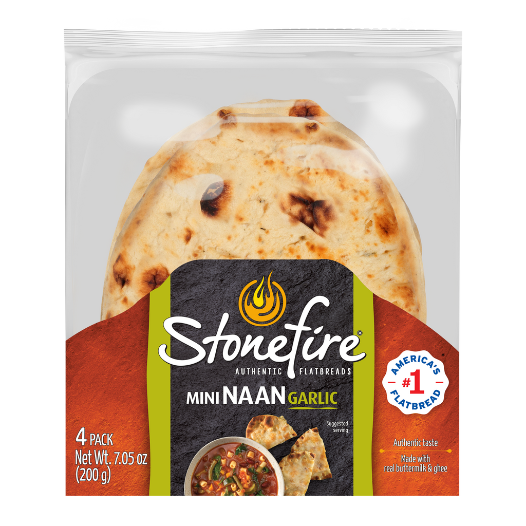 The same recipe as Stonefire® Garlic Naan, now small enough to fit in your toaster! A great alternative to garlic bread, made with buttermilk, ghee, fire-roasted garlic and a hint of cilantro. Soft, fluffy and delicious, serve them with any meal that needs a savoury companion. 4 per pack.