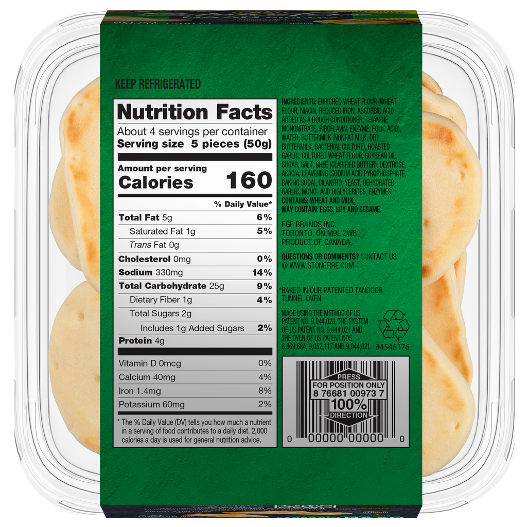 INGREDIENTS: ENRICHED WHEAT FLOUR (WHEAT FLOUR, NIACIN, REDUCED IRON, ASCORBIC ACID ADDED AS A DOUGH CONDITIONER, THIAMINE MONONITRATE, RIBOFLAVIN, ENZYME, FOLIC ACID), WATER, BUTTERMILK (NONFAT MILK, DRY BUTTERMILK, BACTERIAL CULTURE), ROASTED GARLIC, CULTURED WHEAT FLOUR, SOYBEAN OIL, SUGAR, SALT, GHEE (CLARIFIED BUTTER), DEXTROSE, ACACIA, LEAVENING (SODIUM ACID PYROPHOSPHATE, BAKING SODA), CILANTRO, YEAST, DEHYDRATED GARLIC, MONO- AND DIGLYCERIDES, ENZYMES.CONTAINS: WHEAT AND MILK.MAY CONTAIN: EGGS, SOY AND SESAME.