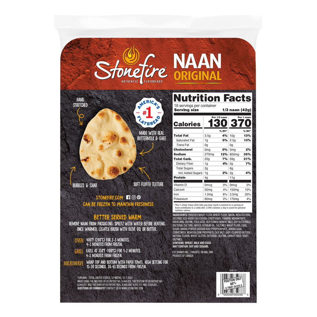 A great alternative to everyday bread, rolls or pita. Great for any occasion – use it as a side bread, tear and share, dip and scoop or make a delicious pizza. Soft, fluffy and delicious! Stonefire® Family Pack Original Naan bread uses high quality ingredients like fresh buttermilk & ghee (clarified butter) and each naan is hand-stretched into its unique teardrop shape. Then each naan is baked in our patented tandoor tunnel to give the texture and taste of a traditional tandoor oven. Stonefire® Original Naan Family Pack is always welcome at your table. Just heat and serve to make any meal special. 6 per pack.