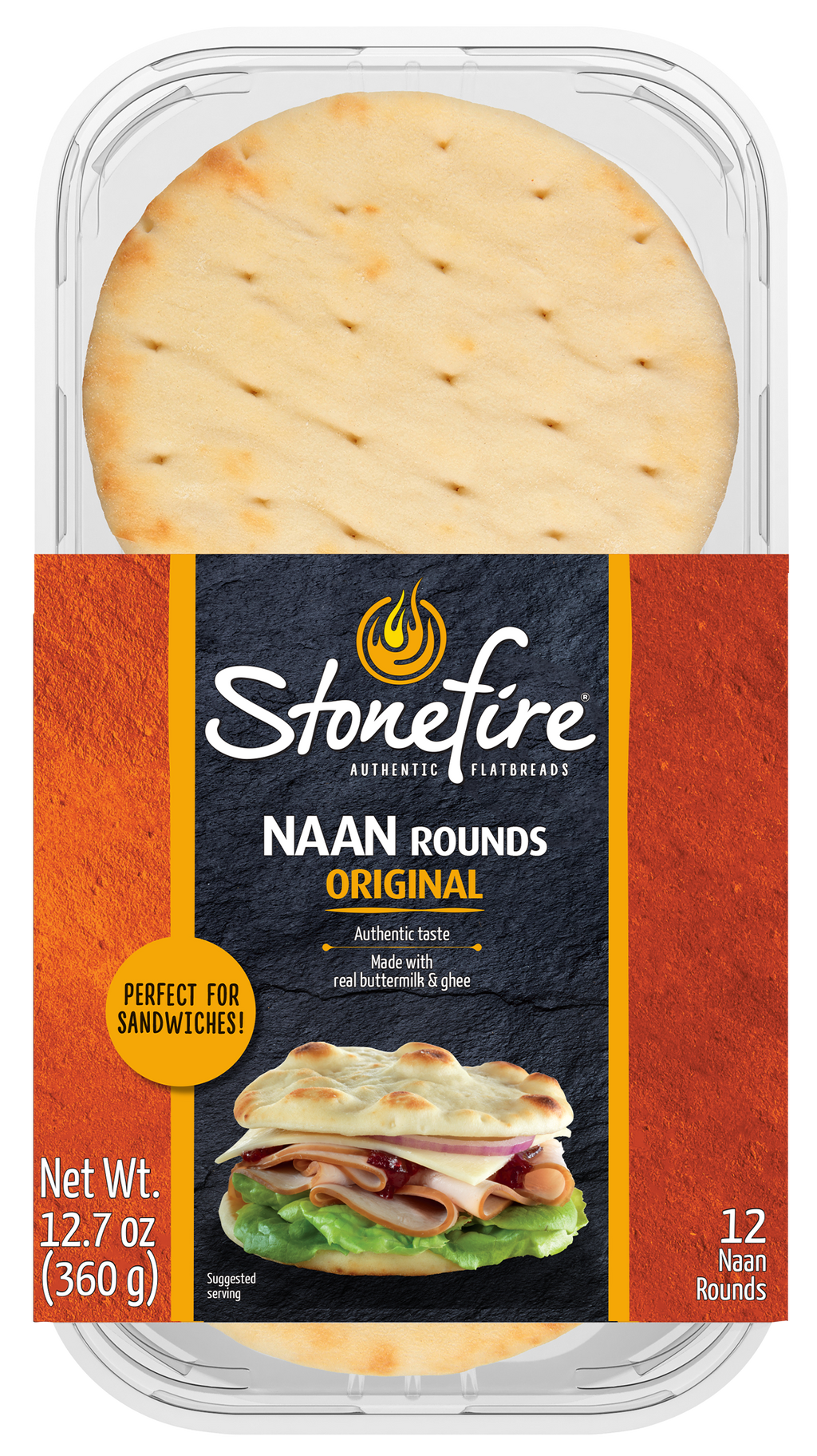 Stonefire® Naan Rounds are every bit as delicious as our Original naan in a versatile, hand-held size. Prepared in small batches and tandoor tunnel oven baked, Naan Rounds have a fluffy texture and are perfectly sized for sandwiches, snacks and appetizers. Get creative in the kitchen as you stack, top, layer or fold. 12 per pack