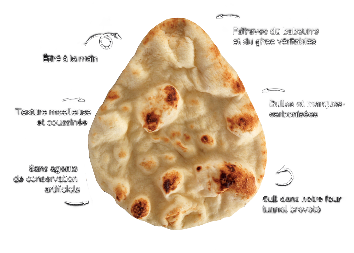 Le naan authentique est préparé avec du babeurre frais et du ghee (beurre clarifié), et il est étiré à la main pour lui donner sa forme emblématique de goutte d’eau, puis cuit à la flamme dans un four à haute température, pour lui donner ces marques carbonisées classiques et ces bulles incomparables.