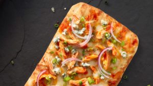 All the goodness of buffalo wings, without the sticky fingers! This flatbread recipe can also be prepared ahead of time and frozen. Make a bunch and then just pop them in the oven as needed. Get the recipe