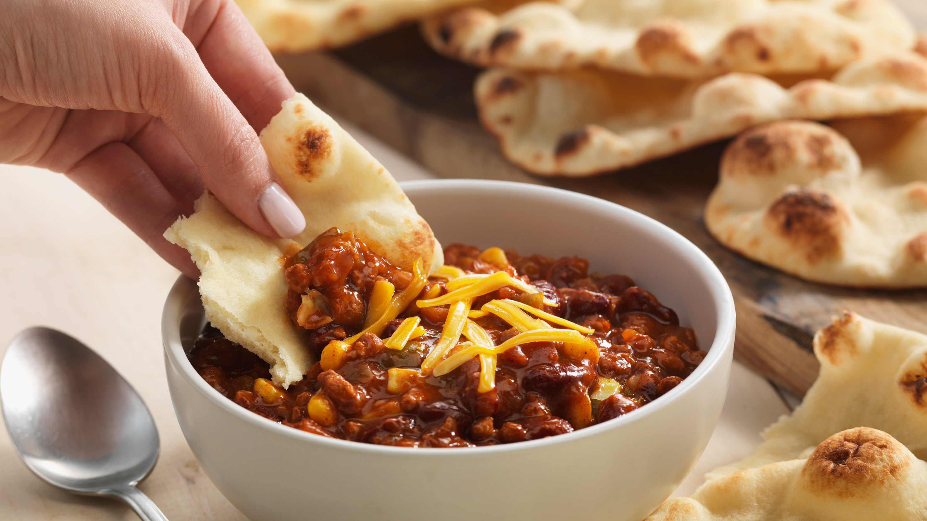 Chili by itself is just…chili. Take on tradition and turn a simple bowl of chili into something special by tearing apart a few warm pieces of Stonefire® Naan. Pro tip: Our chili recipe calls for two ounces of jalapenos but cut it down to one ounce if you or someone at the table prefer a milder dish. OR kick it up to three ounces of jalapenos to kick the heat into high gear. Say ‘bye bye’ to boring and serve that spicy bowl of chili with rich obsessable Stonefire® Naan.