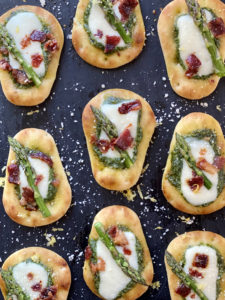 - Flip the Naan Dippers® face-up and spread with pesto. Top with the mozzarella and then the asparagus (don’t worry if every inch of the flatbreads aren’t covered with mozzarella; these are much more beautiful if some of the dipper is peeking out).
