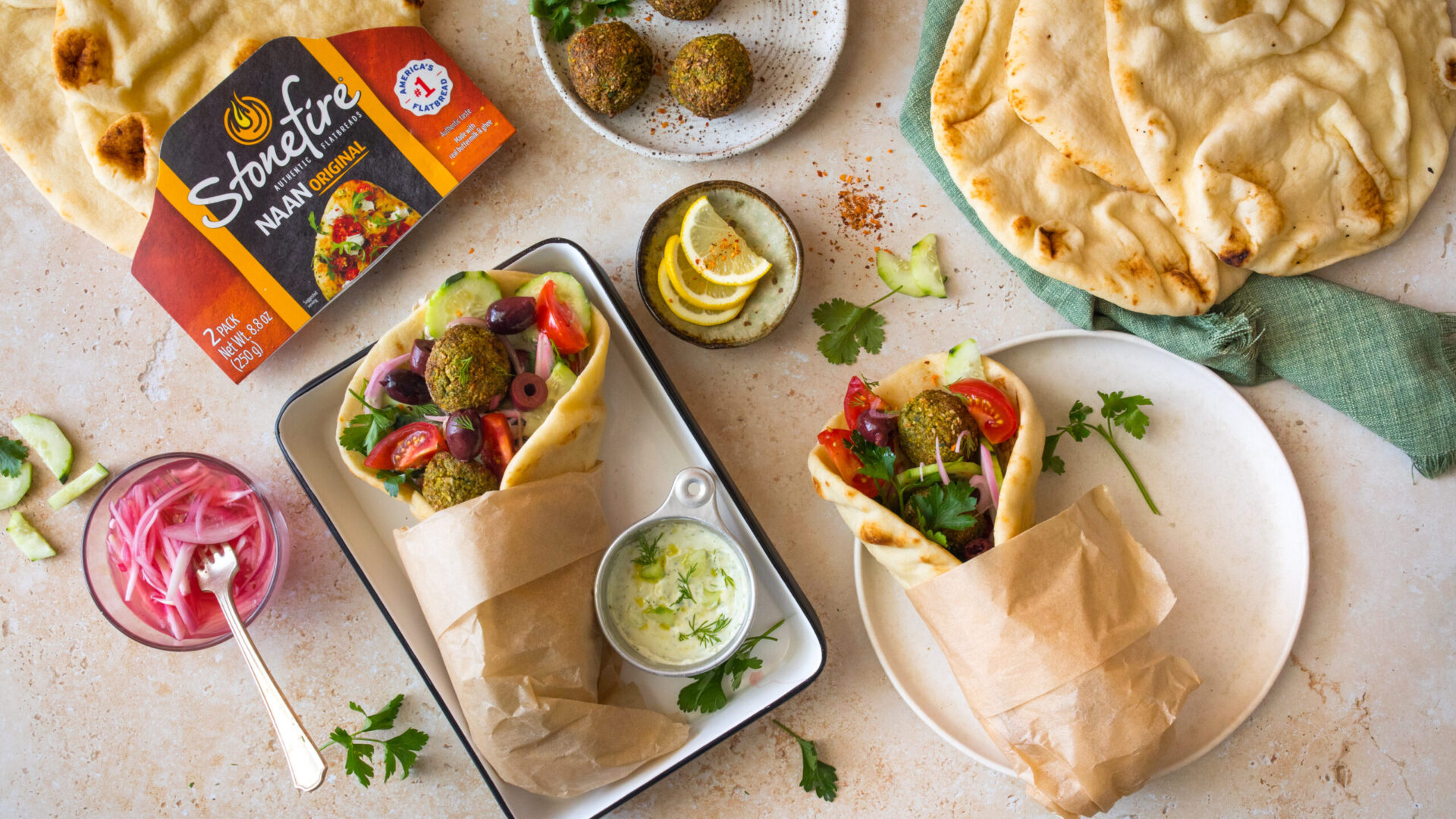 - Assemble Wraps: To assemble the falafel naan wraps, spread tzatziki sauce on warmed Stonefire Original Naan. Top with diced cucumber, tomatoes, falafel, pickled red onions, and fresh herbs. Enjoy!
