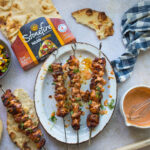 - Serve: drizzle the remaining Bang Bang sauce over the grilled chicken skewers. Serve the skewers alongside the grilled naan or as a wrap with the mango salsa on top. Enjoy!