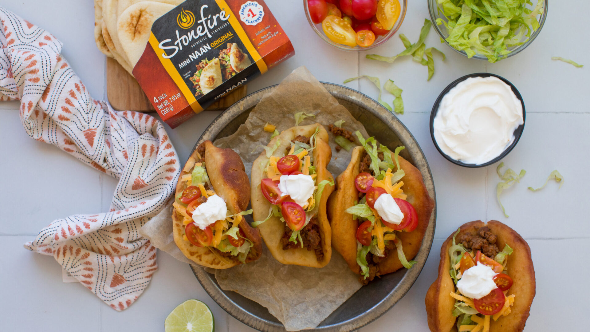 Dive into our take on the iconic Chalupa, brought to life using Stonefire® Original Mini Naan. Create the perfect blend of crunch and creaminess as you craft these iconic Mexican-inspired treats in your own kitchen. From pillowy flatbreads to dreamy taco shells, our recipe lets you customize with classic seasoned ground beef, lettuce, tomatoes, cheese, and sour cream—or let your culinary creativity shine with your favorite toppings on our Stonefire® Original Mini Naan.