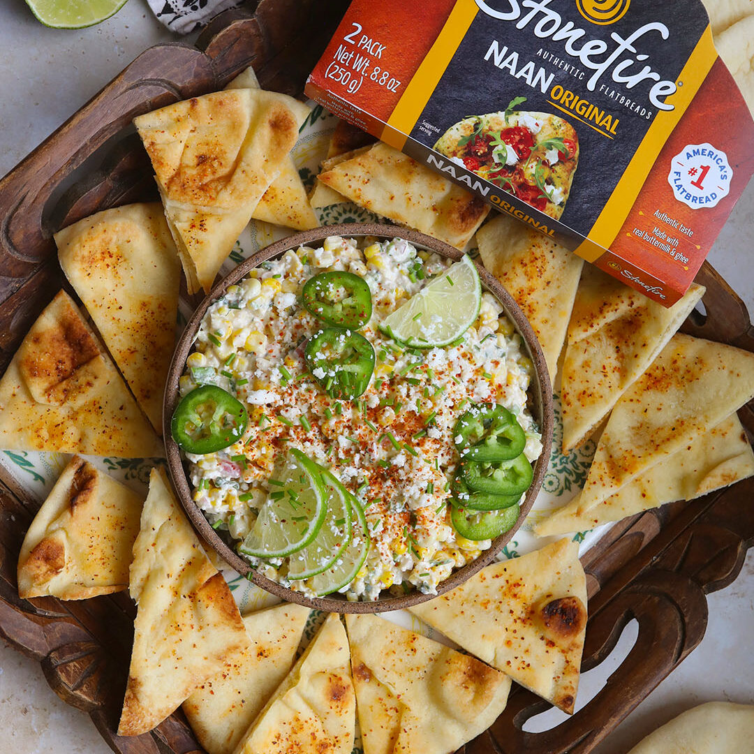 6. Serve the Elote Corn Dip with Stonefire® Original Naan triangles on the side for dipping.