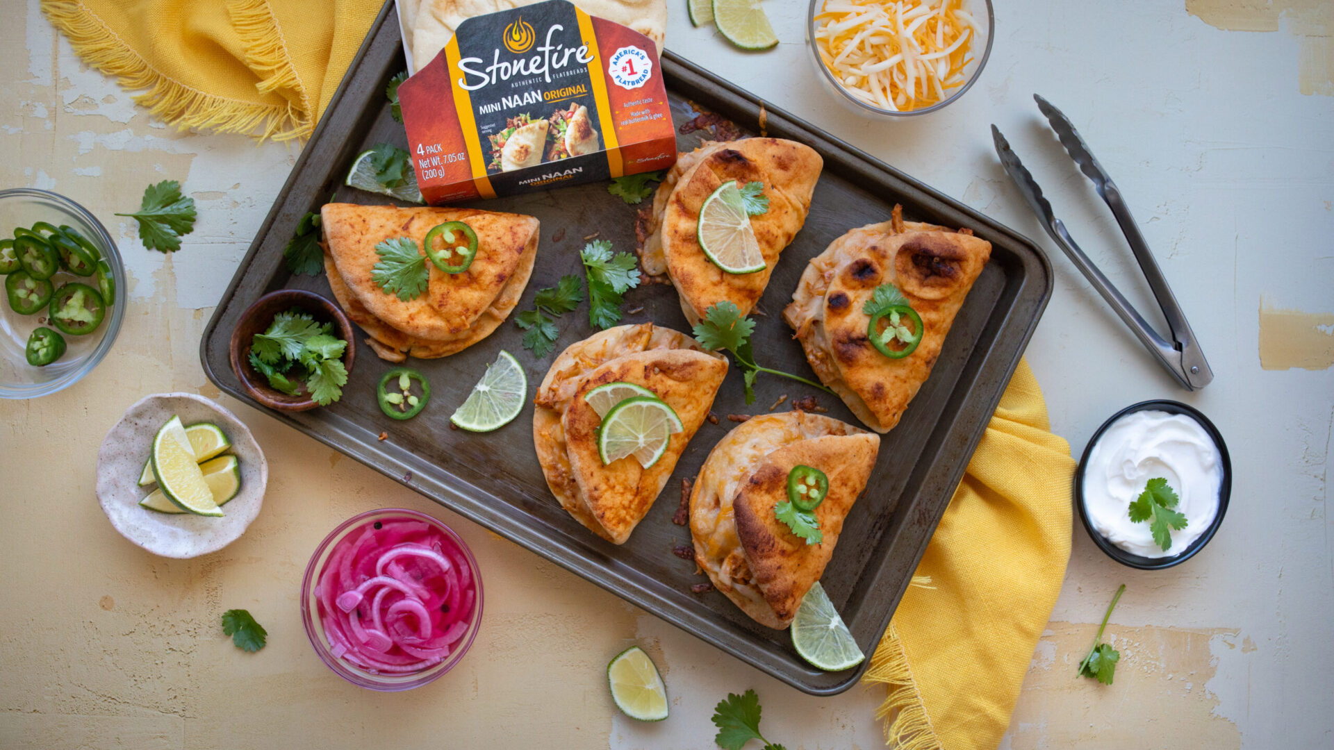 Preheat the oven to 400°F Lay out Stonefire® Mini Naan on a large baking sheet. (tip: microwave the naan for 15-10 seconds so they are soft and fold in half easily) Spoon a generous amount of the chicken tinga mixture onto each naan & top with cheese. Fold in half and brush the naan with a little extra tinga sauce and bake for 8-10 minutes, or until cheese is melted and naan is warm and crispy. Top with desired toppings. We love mashed avocado, pickled red onion, and fresh cilantro. Serve immediately and enjoy!