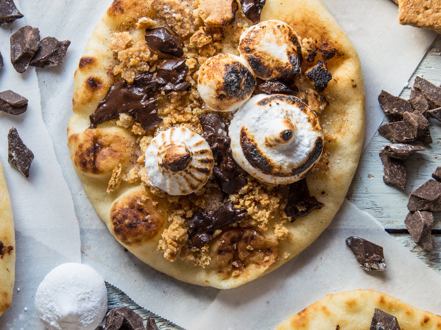 - Add crushed graham crackers evenly across the naan for that classic s’mores crunch.