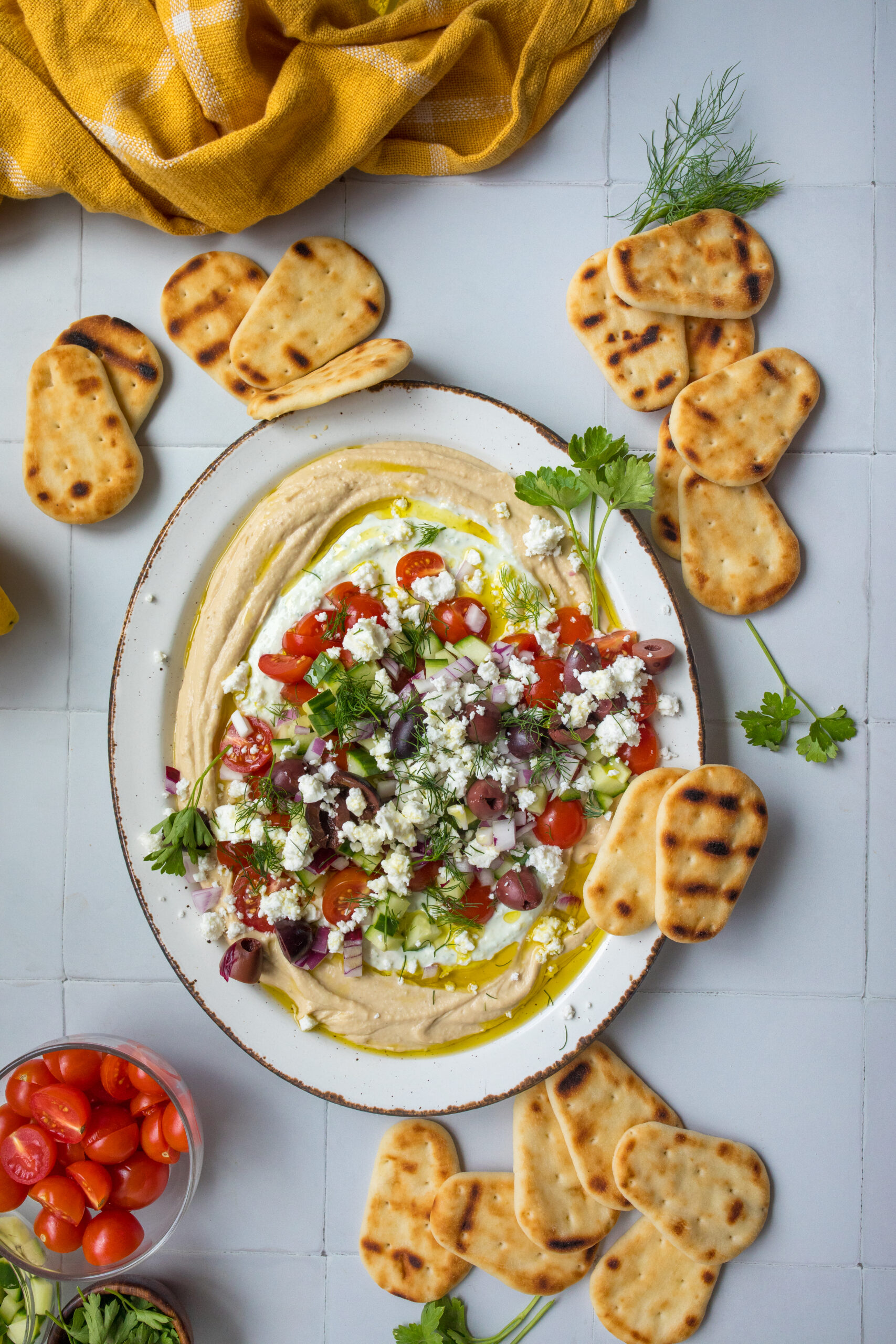 - Prepare the Hummus: Spread the hummus evenly on a large serving platter. Top with chopped cucumber, cherry tomatoes, Kalamata olives, feta cheese, red onion, parsley, and dill. Drizzle with olive oil and sprinkle with lemon zest. Season with salt and pepper to taste.